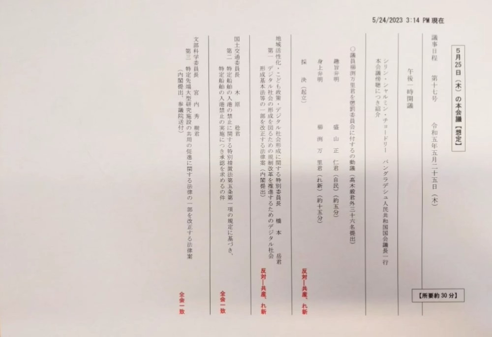 〇今日の本会議はバングラディッシュの議長ご一行が傍聴する中開催されましたが、議題に上がったのは残念な案件でした。れいわ新選組の「議員櫛渕万里子君を懲罰委員会に付するの動議」。