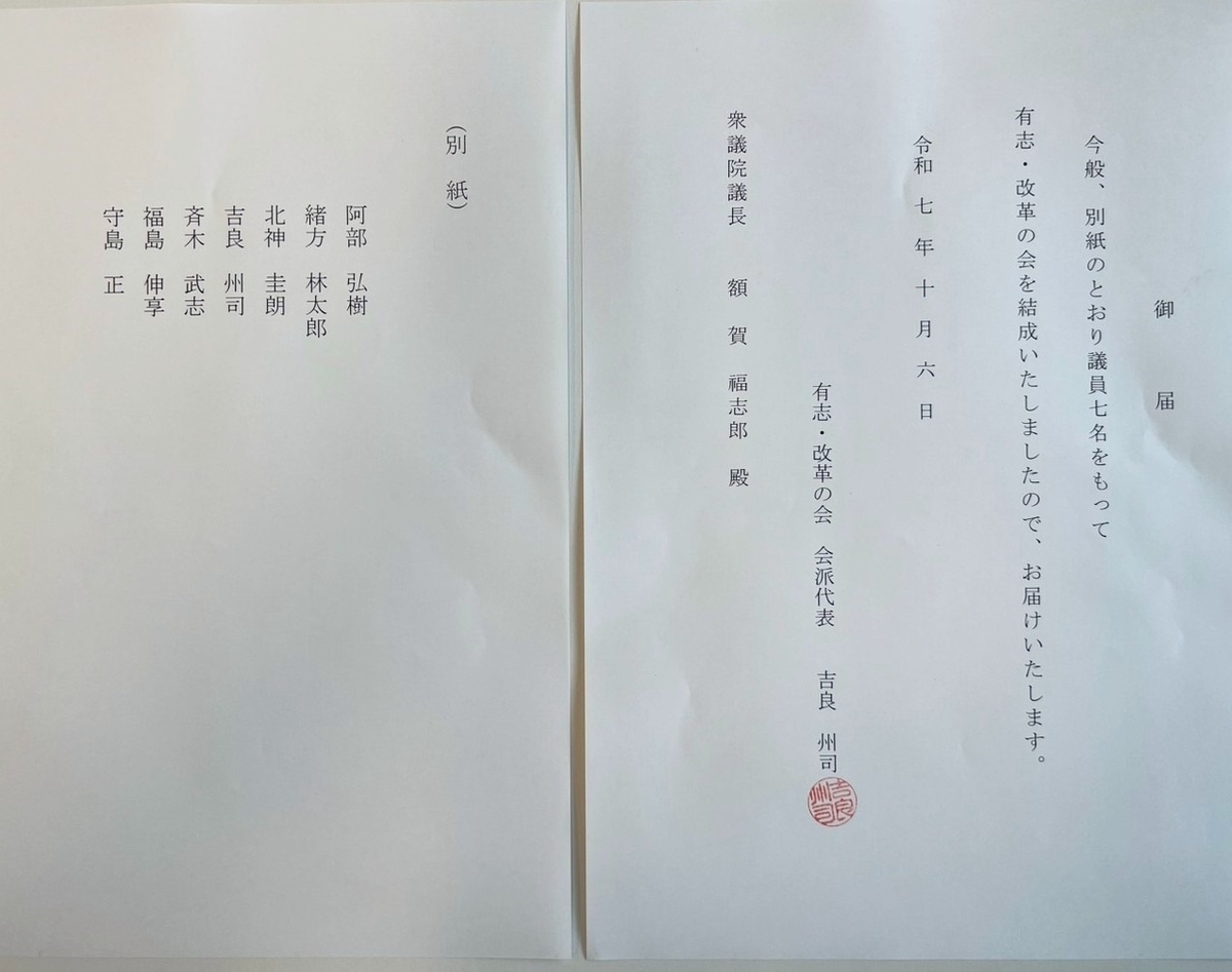 しかし、先のボロボロの自民党総裁選の末に高市総裁が誕生し、これから大きく政局が動く可能性が高い中で、7人が結束して行動することによる日本の政治に与える影響の大きさを考えて、大局的観点から共同会派を結成することを決断したのです。国会のそれぞれの委員会でも、引き続き立法府の名にふさわしい条文ベースでの緻密な議論を行ってまいる所存です。